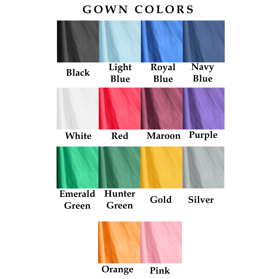 This gown is in a shiny finish and is our most economical option for a graduation gown. This is a high quality gown for a low price. It’s durable enough to be worn several times, as long as cared for properly. The gown is made of 100% polyester, has a satin-like appearance, is traditionally styled with two wide front pleats, has wide bell sleeves, and a zipper front. This is the perfect choice for graduation or moving up ceremonies for elementary school, middle school, junior high school, or high school. The gown can also be used for choir, church performances or religious events, theater and plays, and even as part of a Halloween costume.
